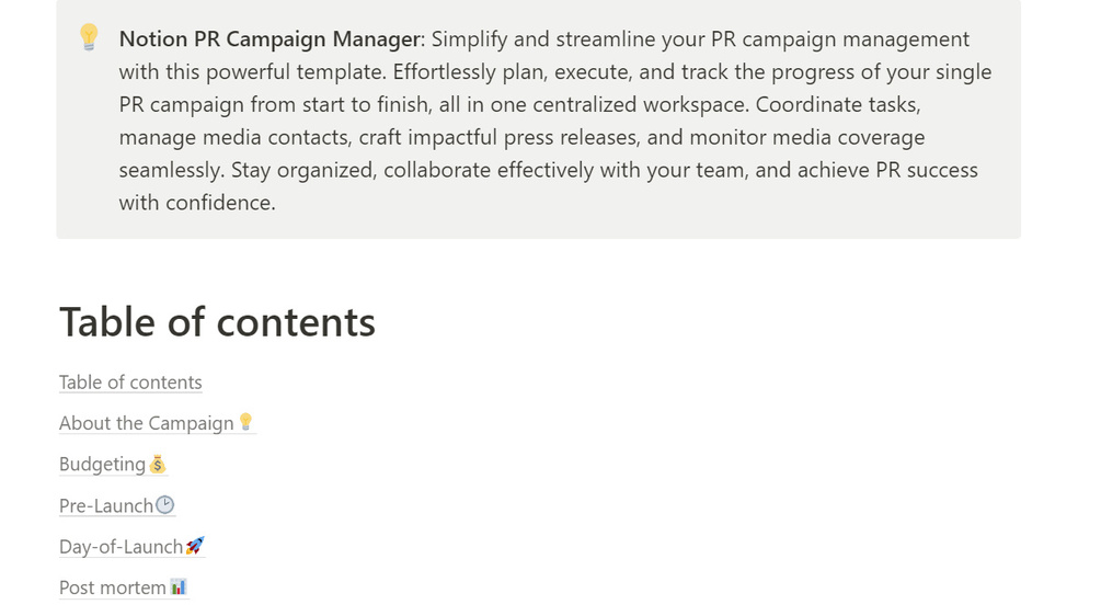With our Notion PR Campaign Manager, you'll not only stay organized but also foster efficient team collaboration. The end result? You'll maximize your PR outcomes, saving you valuable time and resources.